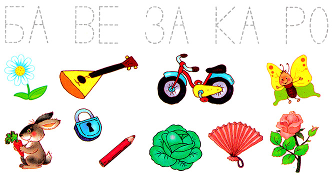 ❀ Обведи в слогах буквы, обозначающие согласные звуки, синим карандашом, а гласные — красным. Прочти слоги, соедини предметы с первыми слогами их названий.